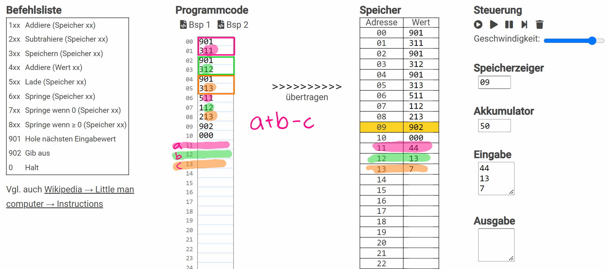 - Laden und Ausführen des Beispiels: Auf Bsp 1 klicken; mit «übertragen» in den Speicher laden; in «Eingabe» zwei Werte untereinander schreiben; mit Play starten.)