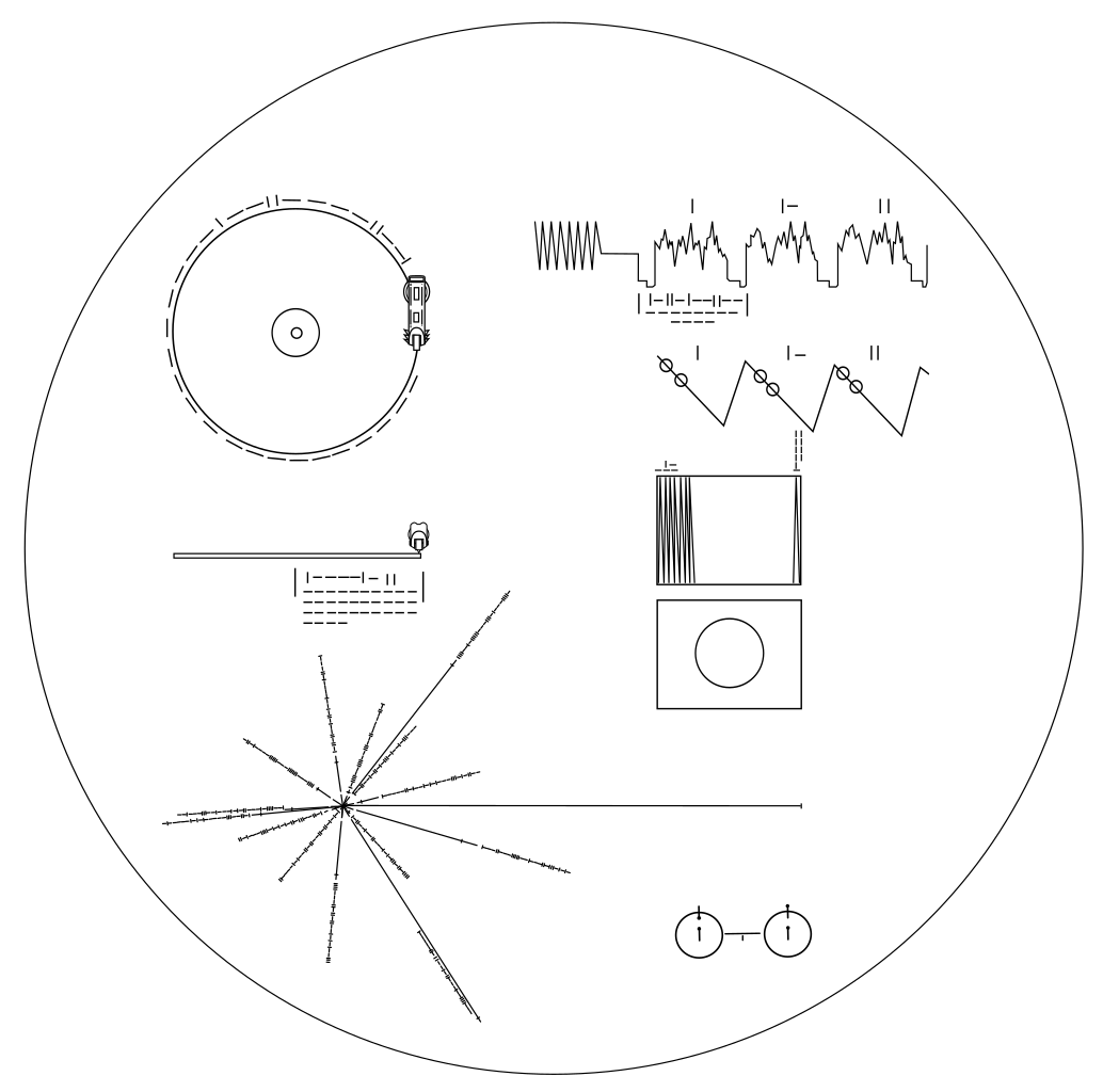 Wenn Wasserstoffatome von einem Energiezustand in einen anderen übergehen, wird elektromagnetische Strahlung freigesetzt. Diese Welle ist das Mass, das in den Abbildungen auf der Tafel verwendet wird. Die Wellenlänge (etwa 21 Zentimeter) dient als räumliches Mass, die Periode (etwa 0.7 Nanosekunden / 10-9 s) als zeitliches Mass. Das letzte Detail dieses Schemas ist ein kleines Häkchen zwischen den Wasserstoffatomen, das diese Werte für Entfernung und Zeit der Binärzahl 1 zuordnet.