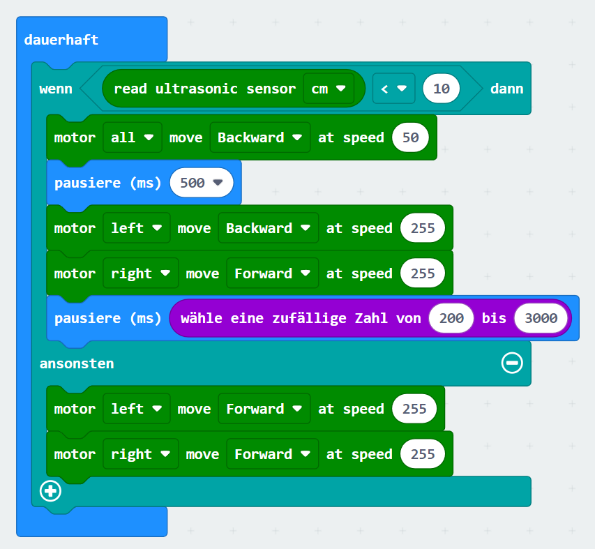 Der Maqueen hat einen Ultraschall-Distanz-Sensor. Versuchen Sie nun einen Staubsaugers zu programmieren: