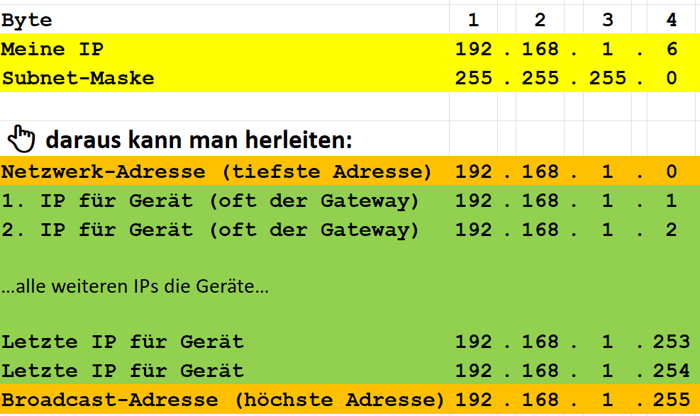 255.255.0.0sind die letzten zwei Bytes (16 Bit) für den Hostanteil reserviert.Tipp: Man kann das auch dezimal rechnen: Ein Byte hat 256 mögliche Werte. Bei zwei Bytes sind es Adressen.