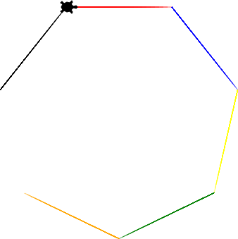 ☝️ Ändern Sie den Code ab, um ein Siebeneck mit verschiedenen Farben zu zeichnen.import turtle eva = turtle.Turtle() farben = ["red", "blue", "yellow", "green", "orange", "lightblue", "black"] for farbe in farben: eva.color(farbe) eva.forward(50) eva.right(360/7)