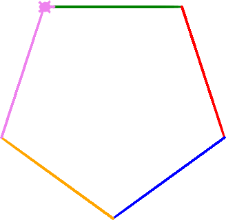 Schreiben Sie ein Turtle-Programm, das mit einer for-Schleife folgendes Fünfeck zeichnen würde. Die Seiten sind 50 lang und das Programm sollte sich anpassen, wenn wir später noch eine sechste Farbe hinzufügen würden.